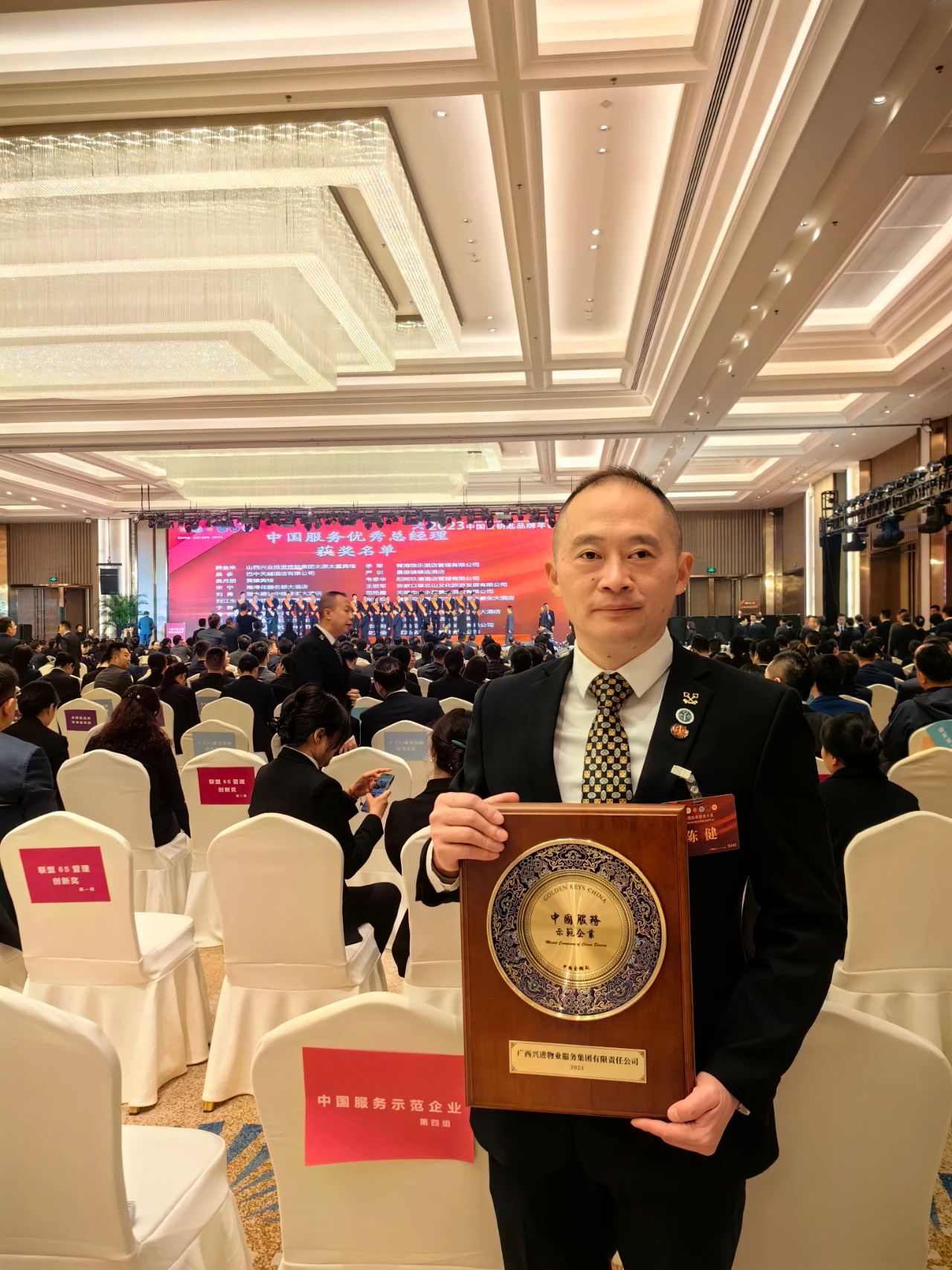 興進服務(wù)集團人力行政總監(jiān)陳健先生(右)與中國金鑰匙主席孫東先生(左)現(xiàn)場合影 經(jīng)金鑰匙聯(lián)盟成員企業(yè)申報及聯(lián)盟總部綜合評定,興進服務(wù)集團憑借高品質(zhì)、高標(biāo)準(zhǔn)的物業(yè)服務(wù),榮獲2023年度金鑰匙國際聯(lián)盟"中國服務(wù)示范企業(yè)",集團總經(jīng)理王永忠先生獲"優(yōu)秀總經(jīng)理"稱號,興進漓江郡府、漓江壹號獲"優(yōu)秀服務(wù)團隊"榮譽稱號。