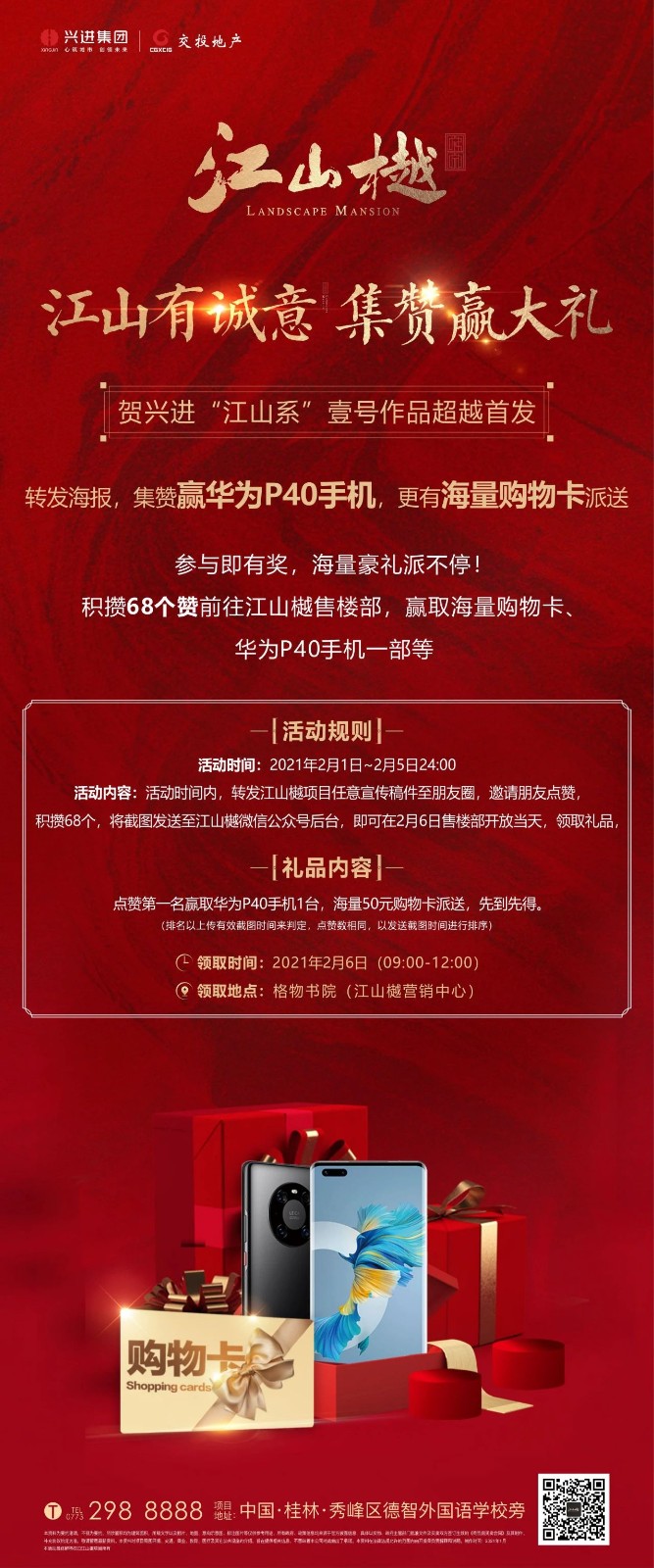 江山樾營(yíng)銷中心格物書院將于2月6日盛大開(kāi)放,賀興進(jìn)"江山系"壹號(hào)作品超越首發(fā),集贊贏華為P40手機(jī),更有海量購(gòu)物卡派送,屆時(shí)將正式揭開(kāi)"江山系"的神秘面紗。
