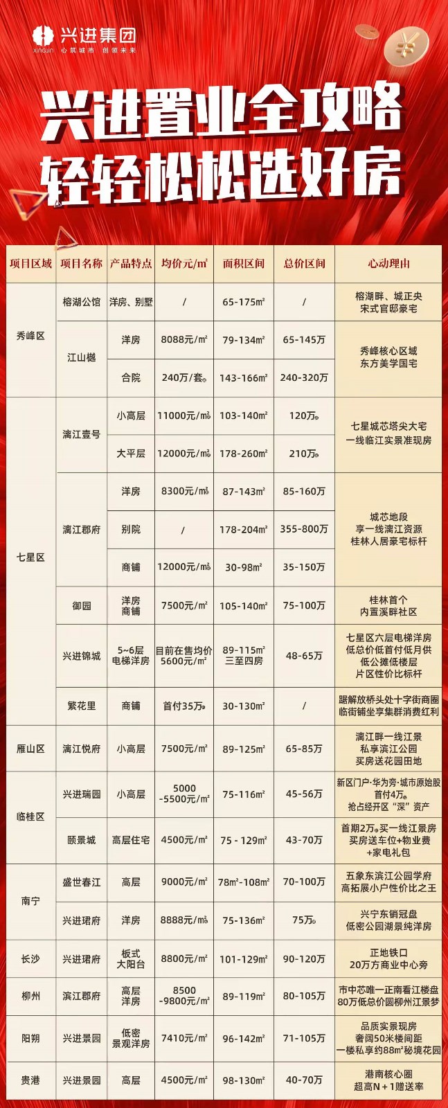 作為深耕桂林24年的本土房企,興進(jìn)集團(tuán)熟悉桂林人的居住喜好,憑借全國(guó)一級(jí)開(kāi)發(fā)資質(zhì)的實(shí)力,堅(jiān)持走精品路線,并以全國(guó)百?gòu)?qiáng)物業(yè)的貼心服務(wù),打造出許多桂林有口皆碑的高端項(xiàng)目。