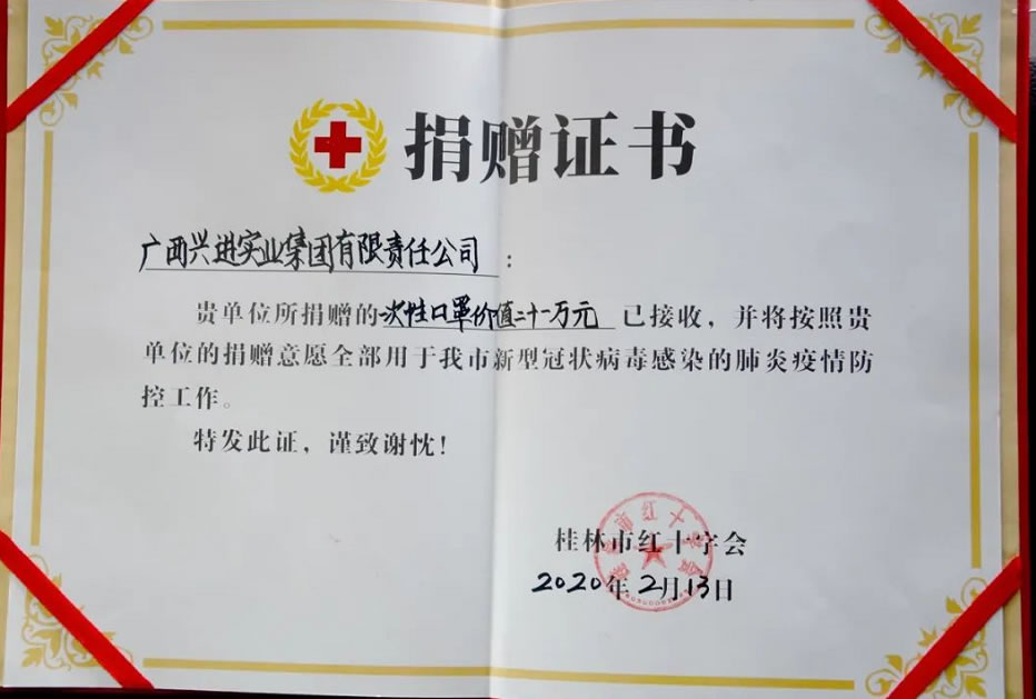 2020年,疫情肆虐的一年,興進(jìn)集團(tuán)第一時(shí)間啟動(dòng)應(yīng)急捐贈(zèng),向武漢市江夏區(qū)紅十字會(huì)、桂林市第二人民醫(yī)院、自治區(qū)南溪山醫(yī)院、桂林市紅十字會(huì)等15家抗疫一線單位,捐助抗疫善款及醫(yī)療物資,總金額超168萬(wàn)元,用鐵肩擔(dān)當(dāng)、愛(ài)心善舉助力疫情防控。