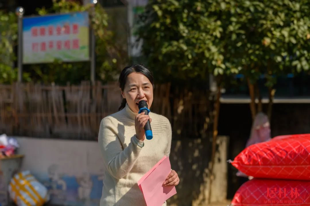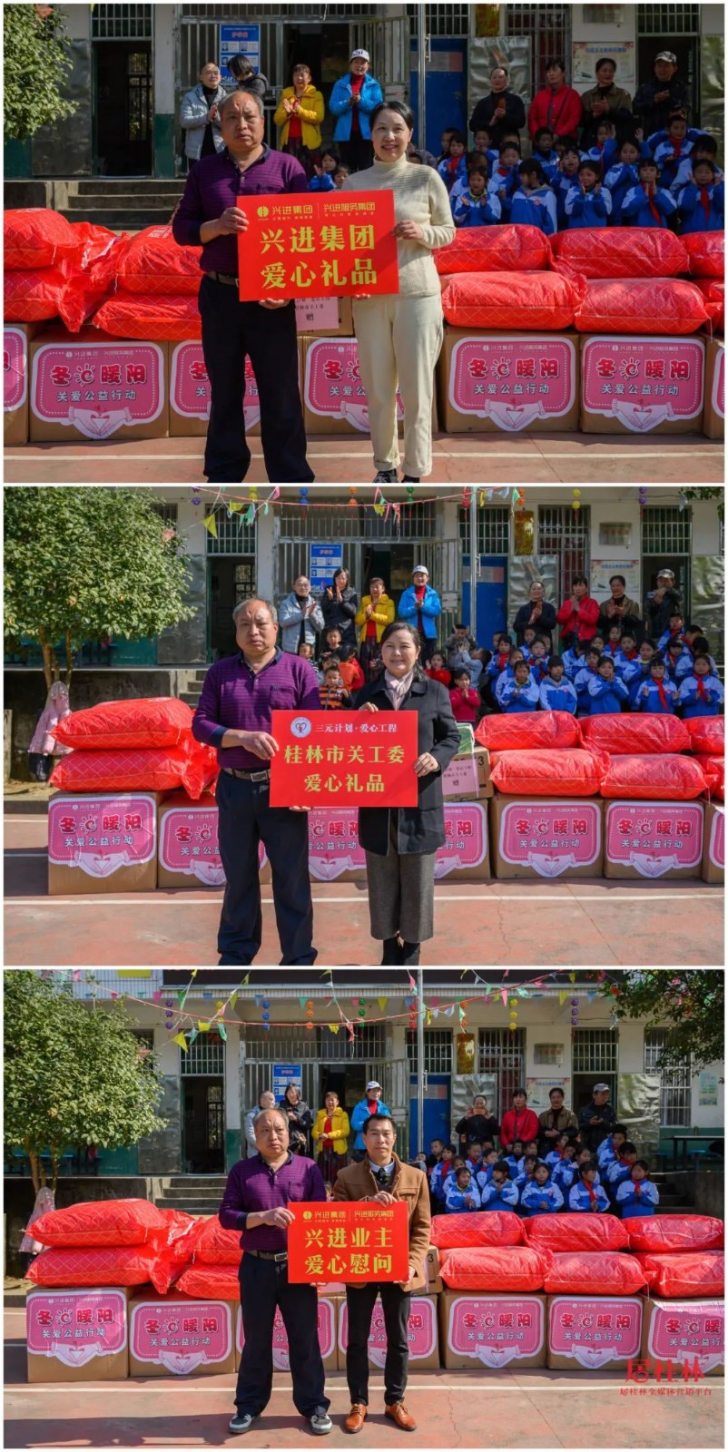 中午12點(diǎn),愛心車隊(duì)抵達(dá)白嶺小學(xué),這位"圣誕老人"終于揭開神秘面紗,他們就是由興進(jìn)集團(tuán)和眾多愛心人士組成的一行30多人愛心公益團(tuán)隊(duì),包括了桂林市市委組織部副部長、老干部局局長、市關(guān)工委副主任黃小桂,市關(guān)工委副主任王榕,市關(guān)工委辦公室主任宦福成,全州縣委組織部副部長、老干局部局長、縣關(guān)工委副主任韋同波,全州縣關(guān)工委辦公室主任劉鑫,五老成員愛心人士宋慧萍、周佳、唐軍紅、黃潔瓊等。